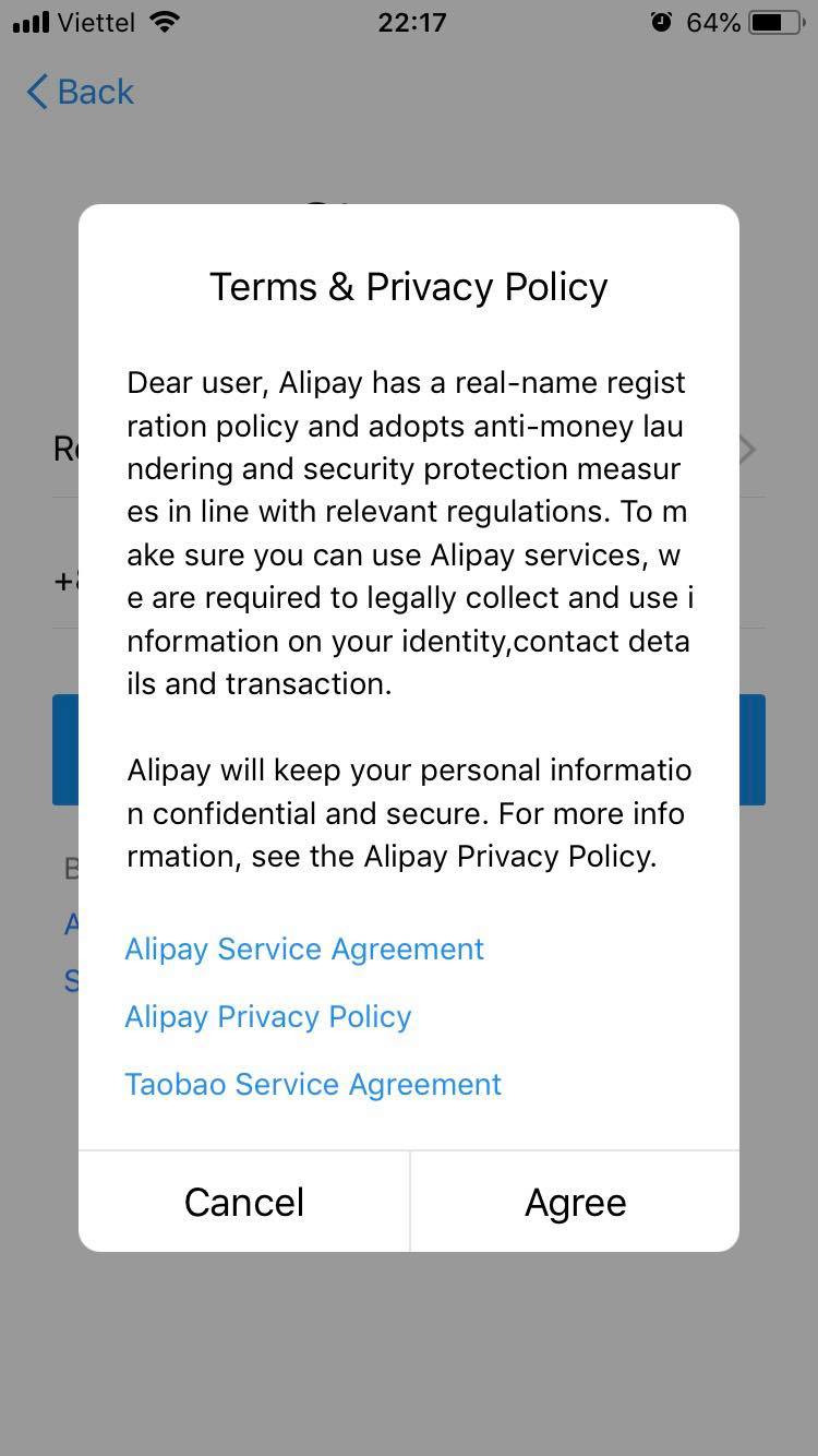Sau khi truy cập vào app, lựa chọn “Agree” để đồng ý tuân thủ các điều khoản, quy định của Alipay