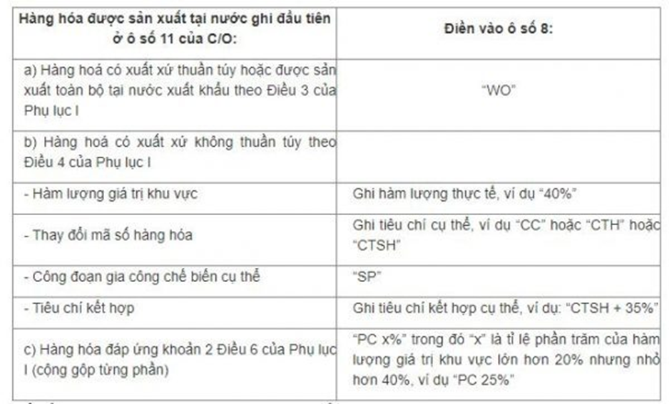 - Mục 8: Tiêu chuẩn xuất xứ: Xem ở trang sau C/O để chọn. Tùy loại hàng mà có từng tiêu chuẩn riêng.