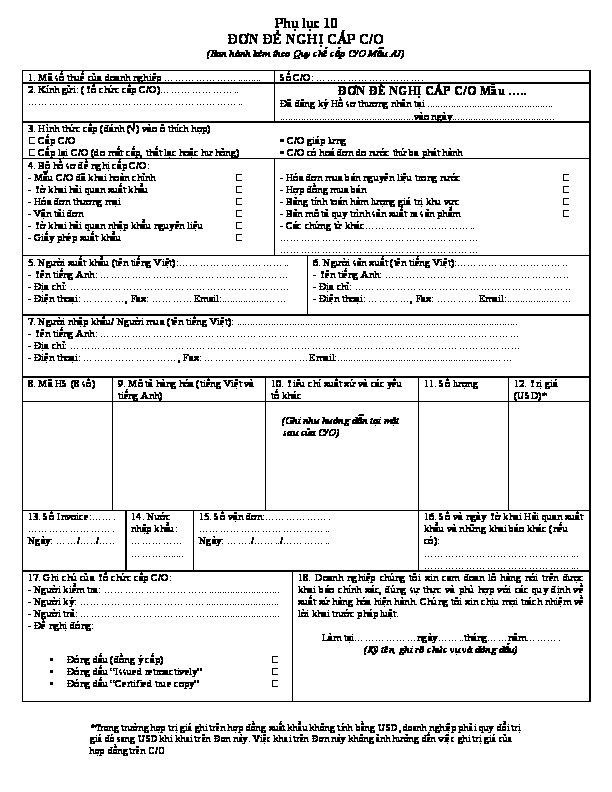 - Đơn đề nghị cấp C/O: Mẫu Phụ lục 10 – Ban hành kèm theo Thông tư số 21/2010/TT-BCT ngày 17 tháng 5 năm 2010 của Bộ Công Thương thực hiện Quy tắc xuất xứ trong Hiệp định thương mại hàng hoá ASEAN.