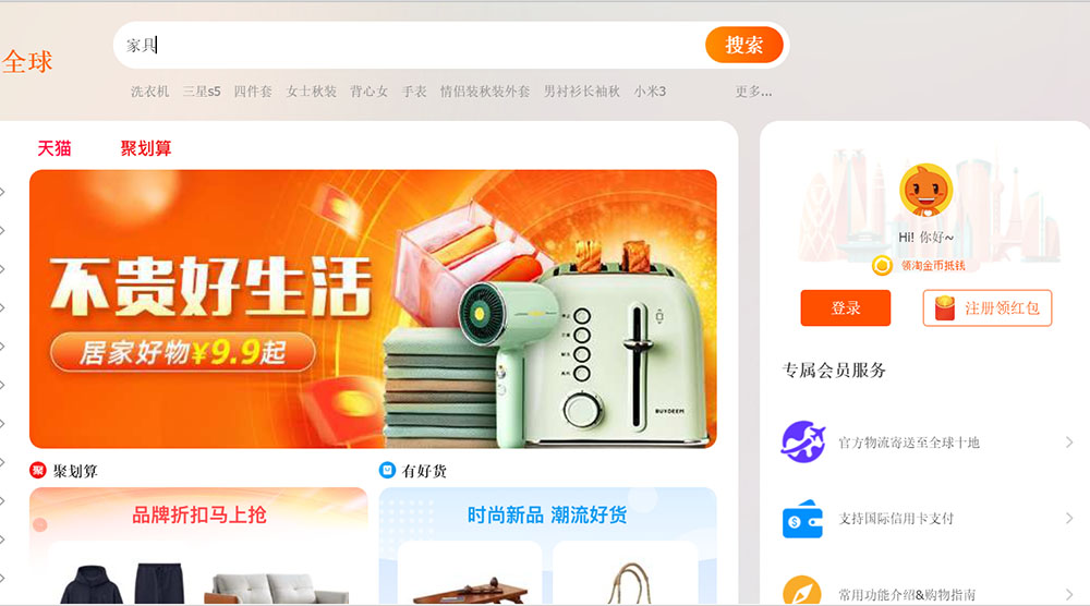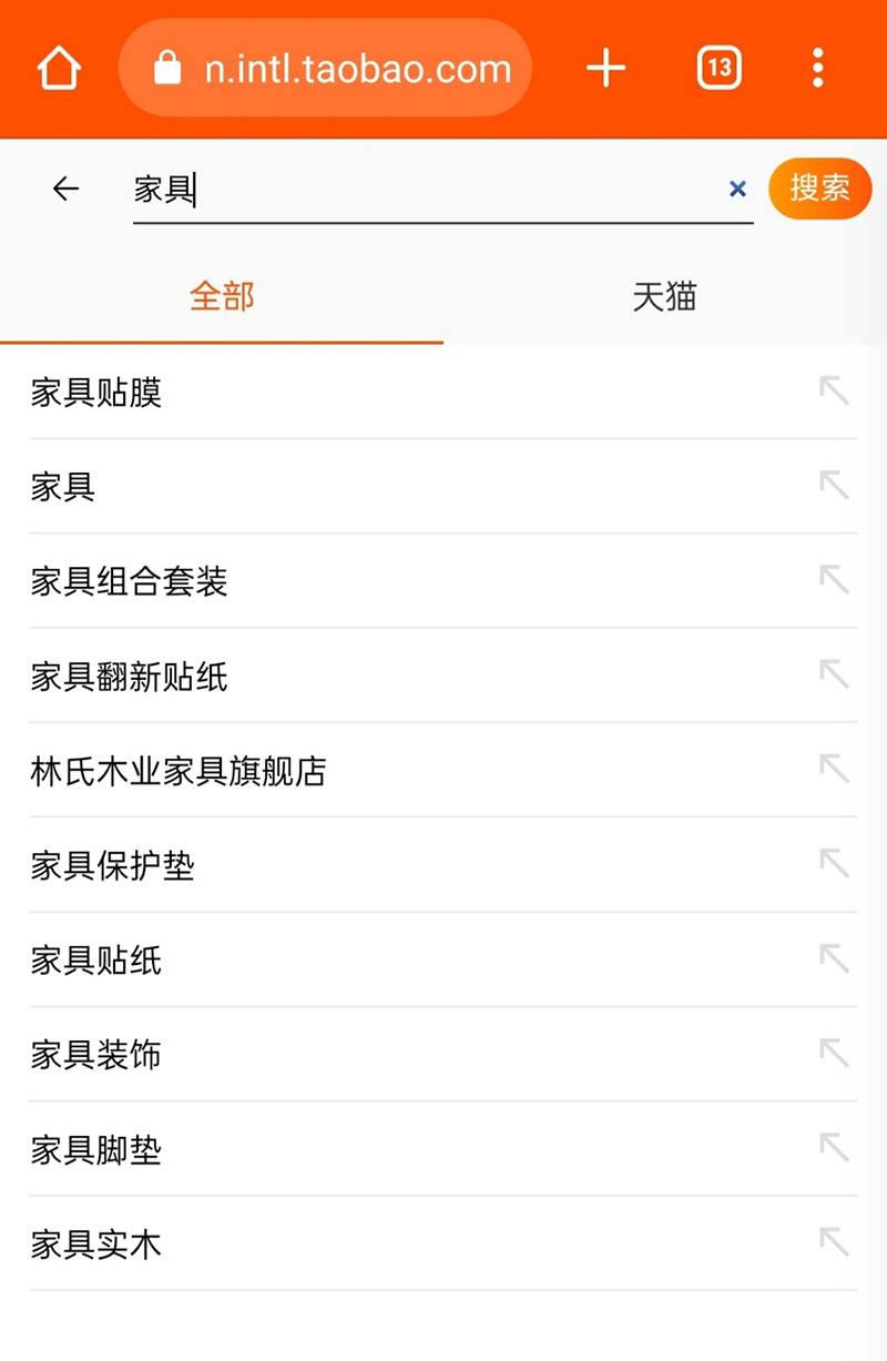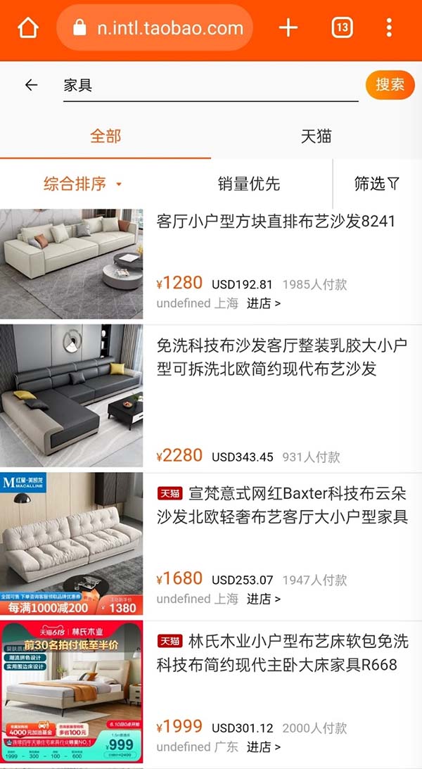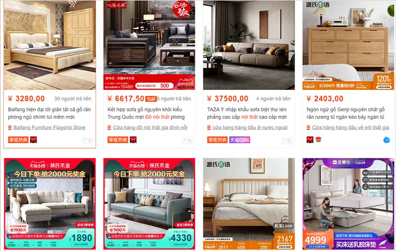 Dưới đây là ví dụ cụ thể về cách tìm kiếm sản phẩm trên Taobao qua thanh công cụ tìm kiếm. Theo đó sản phẩm cần tìm ở đây là đồ nội thất.