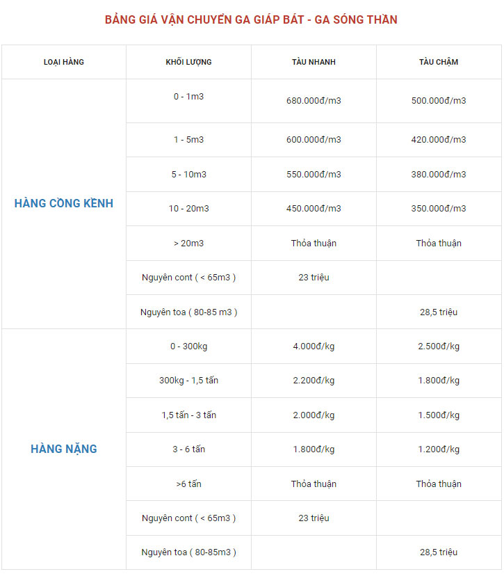 Tàu hỏa là phương tiện vận chuyển được rất nhiều loại hàng hóa khác nhau tùy vào nhu cầu của bạn. Tuy nhiên quy trình vận chuyển từng loại hàng hóa bằng tàu hỏa lại khác nhau. Điển hình nhất là cách chúng được đóng góp, xếp lên các toa tàu trước khi vận chuyển. Vậy nên, mọi người thường phân loại các loại hàng hóa để tính giá cước vận chuyển bằng tàu hỏa. Bạn có thể tham khảo thêm giá cước vận chuyển từ ga Giáp Bát đến ga Sóng Thần của SIMBA GROUP mới nhất như sau: