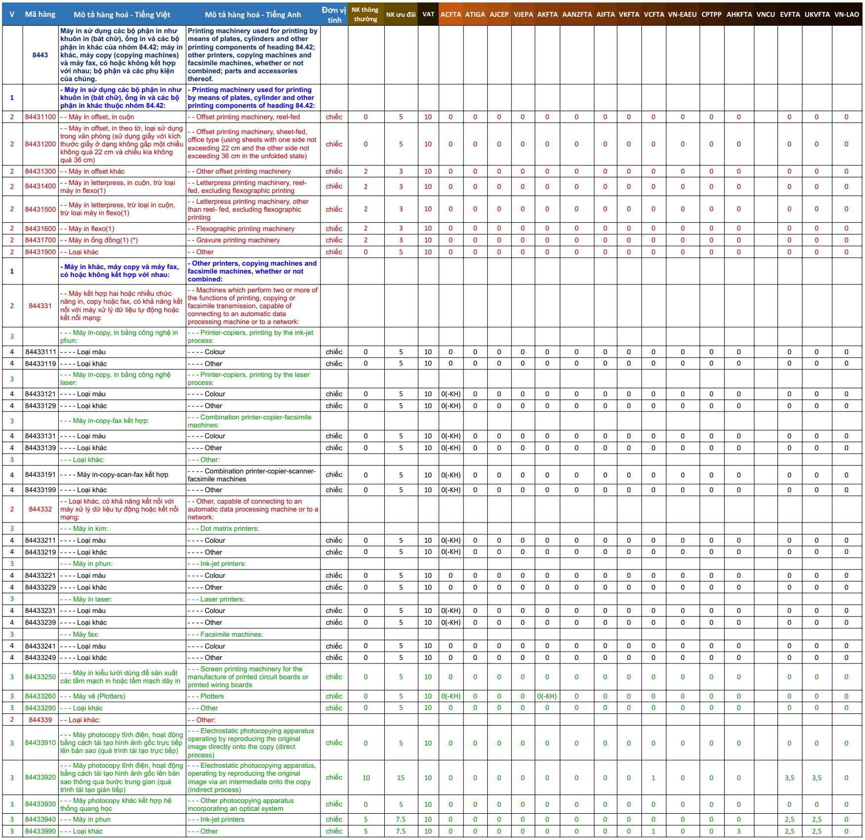 - Máy in offset, in cuộn - Mã HS 84431100: Thuế nhập khẩu thông thường (5%), thuế nhập khẩu ưu đãi (0%), thuế VAT (10%).