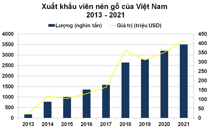 Theo báo cáo của Viforest thì hiện nay Việt Nam đã trở thành nước xuất khẩu viên nén lớn thứ hai trên thế giới, chỉ sau Mỹ. Sản lượng và giá trị liên tục tăng dần qua các năm. Và hiện nay vẫn chưa có dấu hiệu kim ngạch xuất khẩu chững lại. Chỉ tính riêng năm 2021, lượng xuất khẩu viên nén gỗ đạt trên 3,5 triệu tấn, mang về hơn 400 triệu USD cho ngành gỗ.