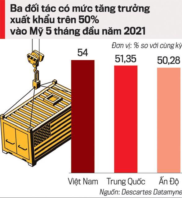 Điều đáng ghi nhận ở đây là con số hơn 1 triệu TEUs sản lượng của chỉ 5 tháng đầu năm này chính là sản lượng “mơ ước” cả năm xuất khẩu vào Mỹ của Việt Nam trong giai đoạn trước năm 2018. Việt Nam cùng với Trung Quốc (tăng trưởng 51,35%) và Ấn Độ (50,28%) là ba đối tác xuất khẩu vào Mỹ có mức tăng trưởng trên 50% so với cùng kỳ của sản lượng 5 tháng đầu năm 2021 (nguồn: Descartes Datamyne).